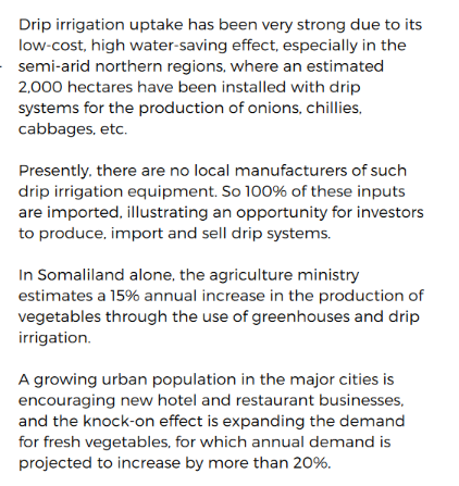Separate from this, when it comes to agricultural production driven by locals and private investors, things are moving forward rapidly through key developments, micro-irrigation and drip systems, solar-powered pumps, and micro-financing.