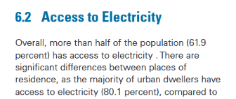 60% of Somalis nationwide, and 80% in urban areas, have access to electricity