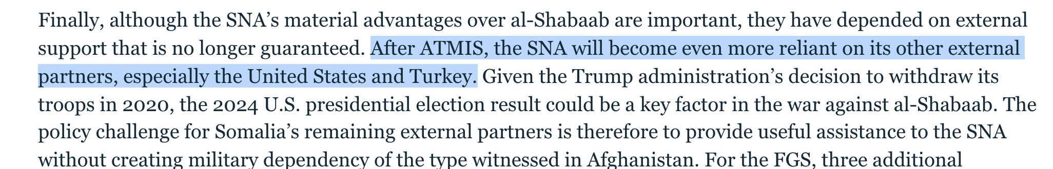 In Somalia, the ATMIS exit raises legitimate security concerns, but a similarly rapid and complete collapse of the SNA and total victory for al-Shabaab is unlikely. Not only would the SNA retain significant external security assistance from the United States, Turkey, the European Union, UAE, Qatar, the United Kingdom, and other countries, but ATMIS’ departure would undermine a key element of al-Shabaab propaganda. Moreover, the SNA already endured the partial withdrawal of a key security partner when the Trump administration removed most of the roughly 700 U.S. troops from Somalia in December 2020. The impact on the SNA was not positive but nor was it catastrophic"