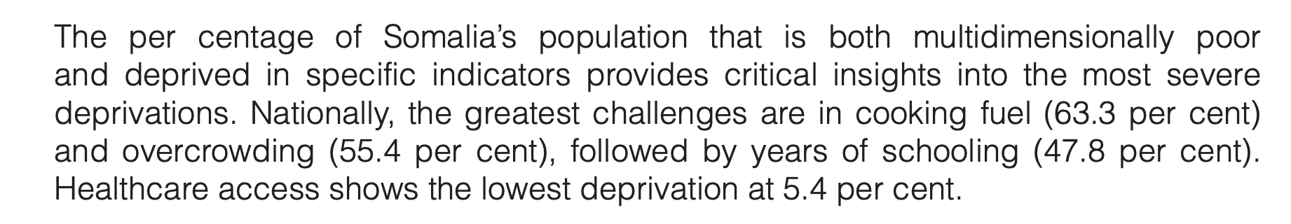 The gap between the urban and rural/nomadic population is irrelevant if they are both struggling. The biggest issues seem to be lack of cooking fuel, education and overcrowding. What is interesting is that Somalia seems to be doing well with healthcare, majority of the population can see a medical professional if need be. I did read a medical school in Xamar is an recognized institute in Denmark and can be used when seeking licence.