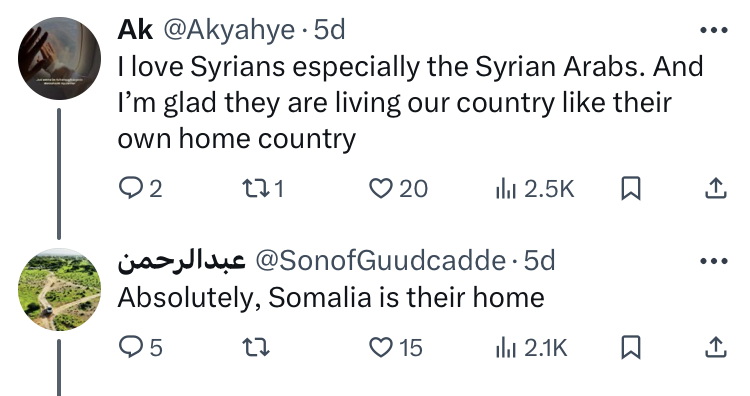 While some Somalis can go overboard with the ‘love’ they show to other communities that have never done anything for them (e.g. Eritrea/Eritreans), I think it’s pretty justified in this case. Somalis who were in Syria have very positive opinions about the country generally speaking.