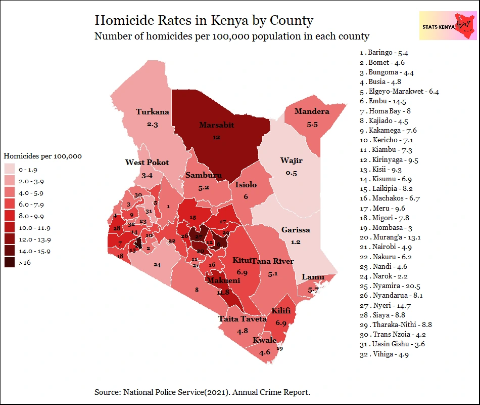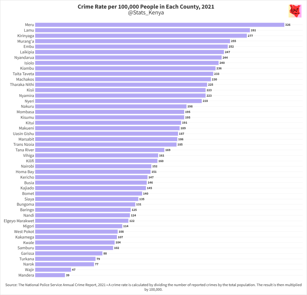 According to the 2025 Economic Survey by the Kenya National Bureau of Statistics (KNBS), these five counties recorded the lowest number of crimes reported to police in 2024, reflecting their relative safety compared to other parts of the country.