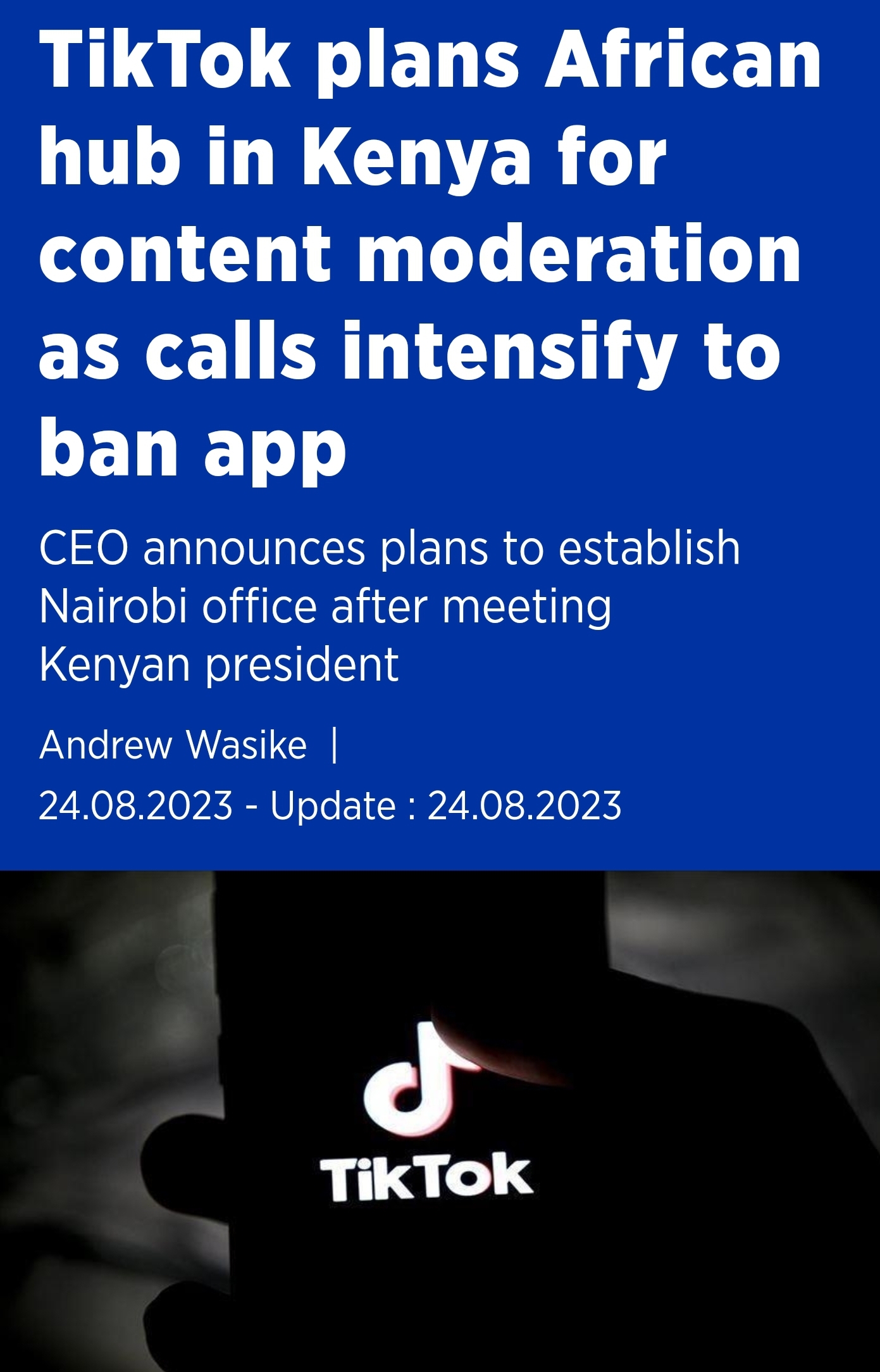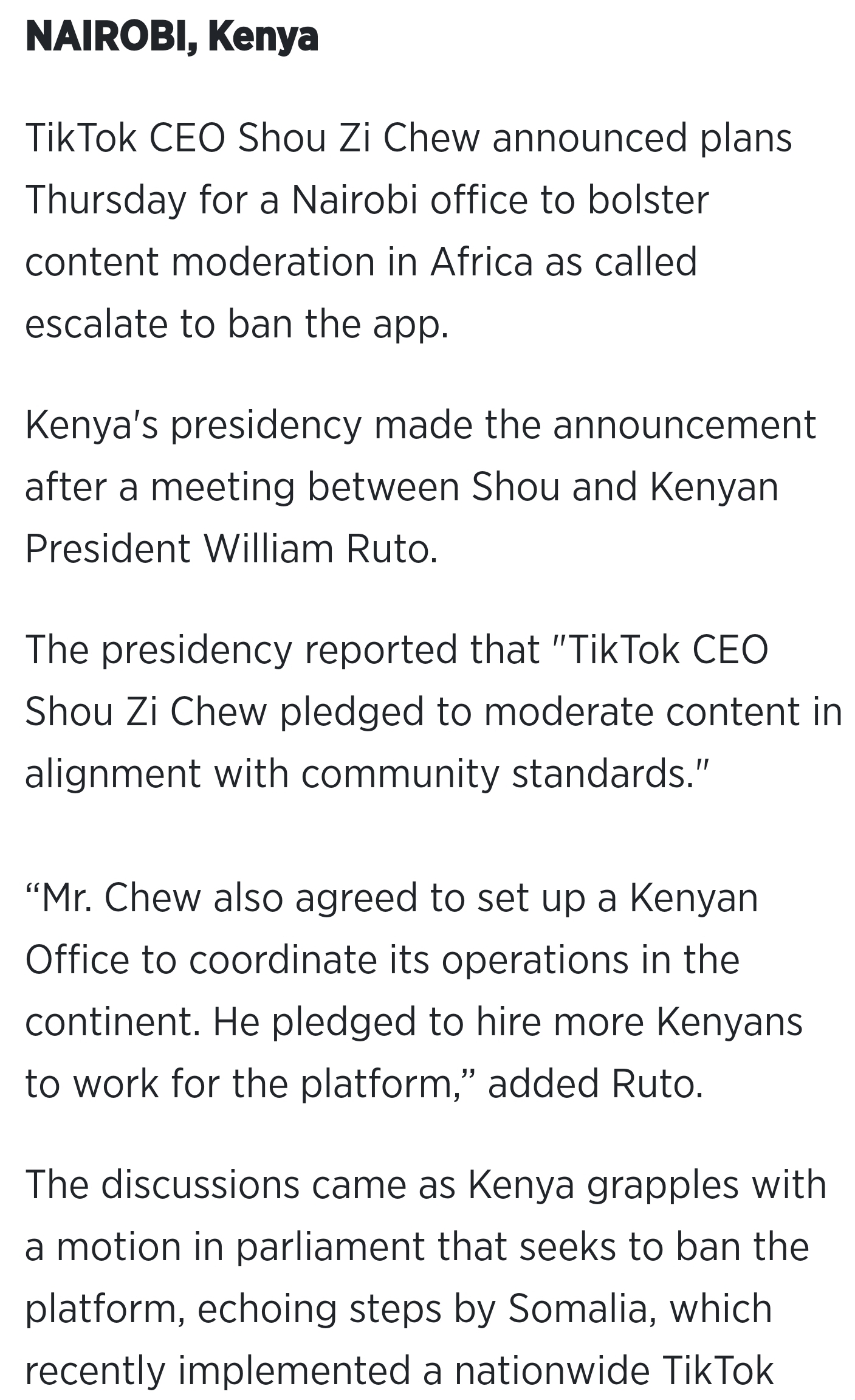 Walahi is starting to make sense for me why so many hate videos for Somalis are going viral and not being taken down. May Allah destroy our enemies. Why aren't Somali Kenyans not becoming moderators???? I need to see that happening a dedicated team of Somalis who cares for our rep to take down any hate videos immediately and for it to never go viral and any positive videos about Somalis go viral. The damage is done regardless.Yes, not only that, but the tiktok CEO met with the Kenyan president to make Kenya their base for content moderation. They will be hiring more Kenyans.