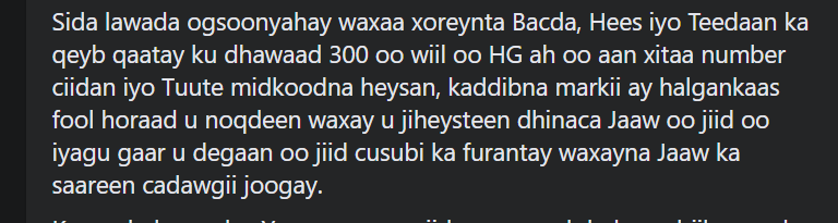 XLow intaan oo aan kaa kachey dhib la'aan oo maanta xoog ku heesto anigoo hiiraan boqol sano ka hor joogin miyaa afka igu soo taage? it is clear nabad la'aanta cida ay u daran tahay and who needs peace. NINKII CAYR LA MAAGANA CAATADAAN U BISLAANO MAAHMAAH WEEYE CAANOO, CAAN AHOO CUSLEEDO. Compare goofado to meesha aan maanta heest0