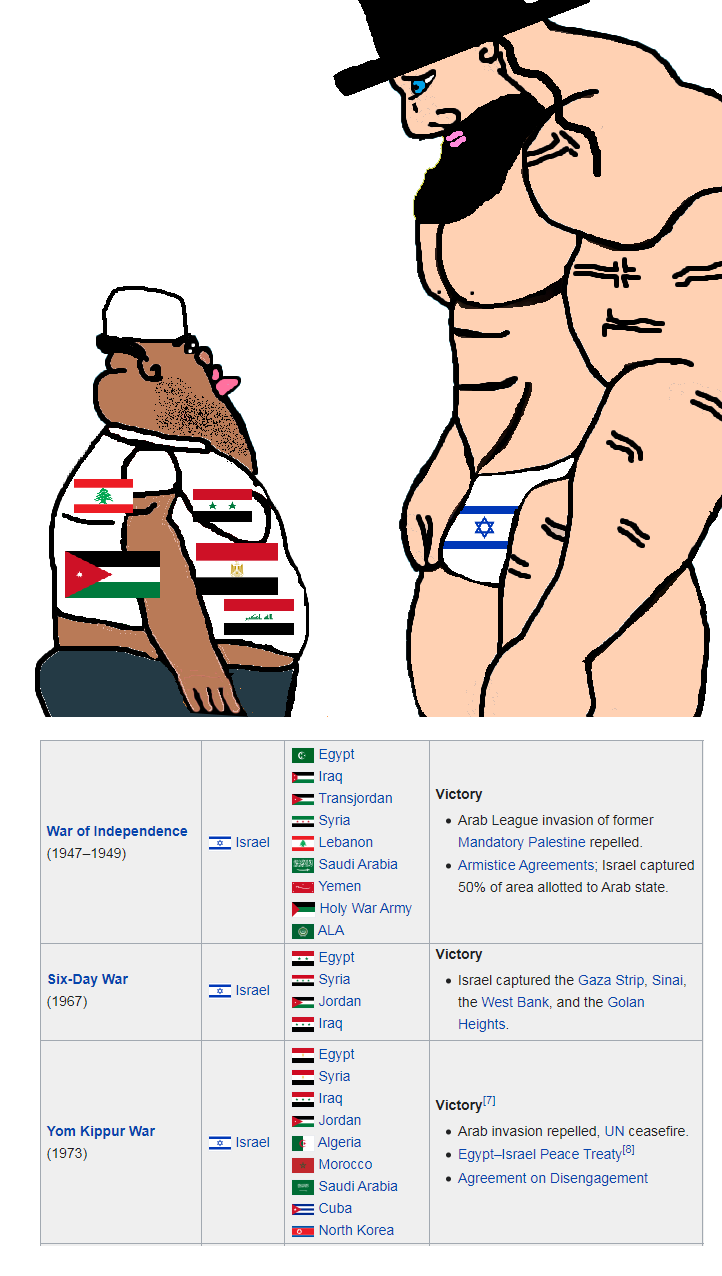 Clear example is Israel all Arab countries can't defeat that tiny country surrounded by all of them it's the humiliation century for Arabs I see dumb Islamists seething here "Mayne Ayrabs are brave and sheeiiit Khalid bin walid wuz ayrab dawg"