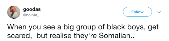 Pretty shitty that people think saying "fucking Somalian" isn't racist. "Black c*nt" is another one.