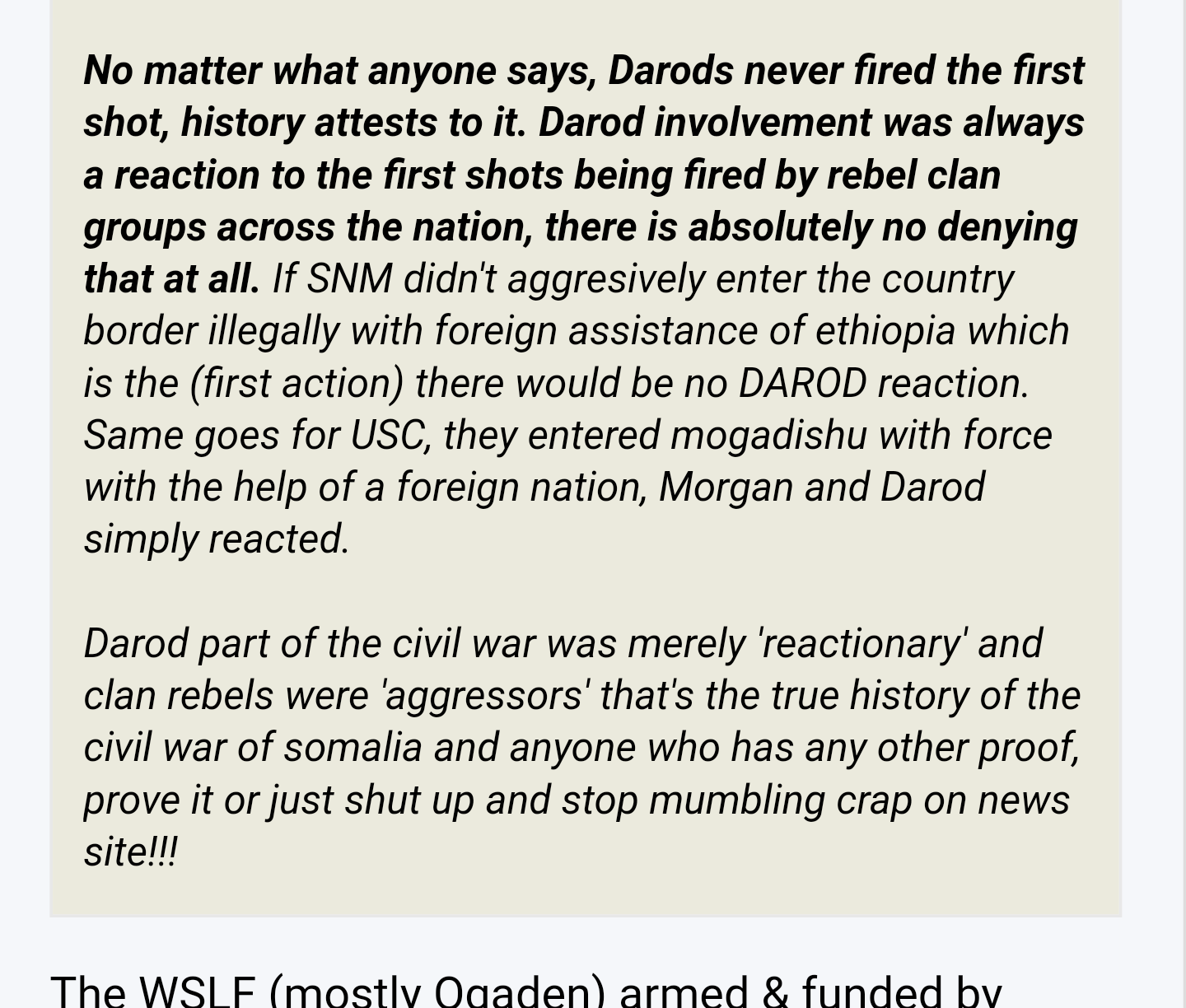 My reply was in response to the bolded part where you said "Darods never fired the first shot, history attests to it" when the WSLF atrocities says otherwise.