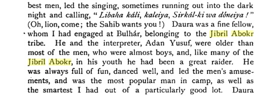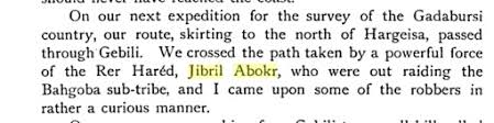 "Ever since Garisa we had heard of proposed attacks by the Jibril Abokr, the most turbulent clan of the Habr Awal, and these rumours had been increasing in intensity till there was almost a panic among our Gadabursi followers, excepting of course the stolid black Sudanese soldiers. These were fine tall men in long shirts reaching to their ... The bush was empty and we were in constant expectation of meeting the raiding Jibril Abokr."