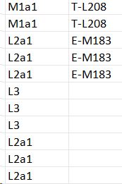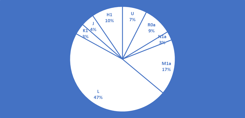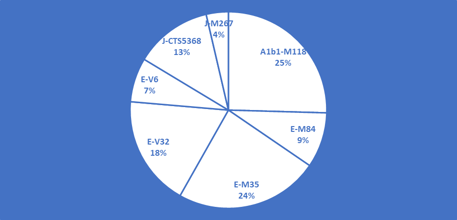 Most common haplogroups pairs: A1b1-M118 with M1a1; E-M35 with L2/L3; J with U
