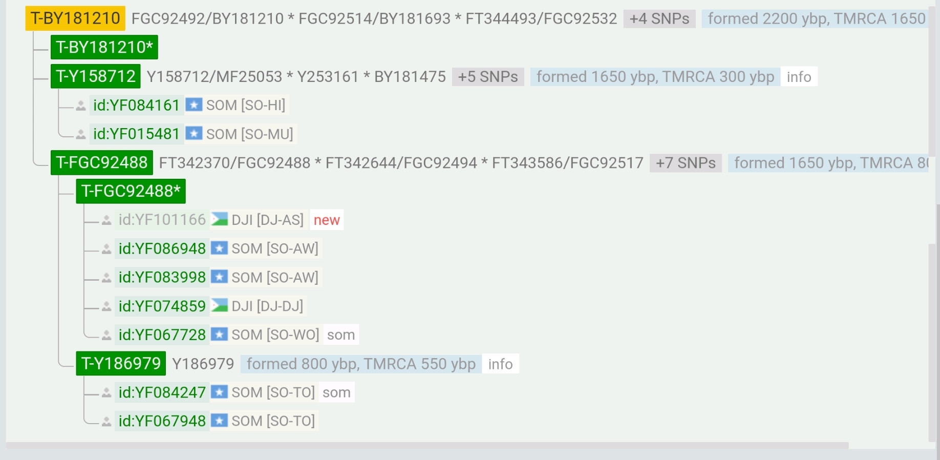 Have you contacted him? If samane abokor are confirmed to have this subclade that means dna resulta arent going in line with subclans pedigree to the extent we assumed it to be, previously I used to assume that all waqooyi T would fall under T-FGC82488Kit id:YF112511 is a Samane Abokor HJ Isaaq sample who was slotted under the basal subclade T-BY181210*.