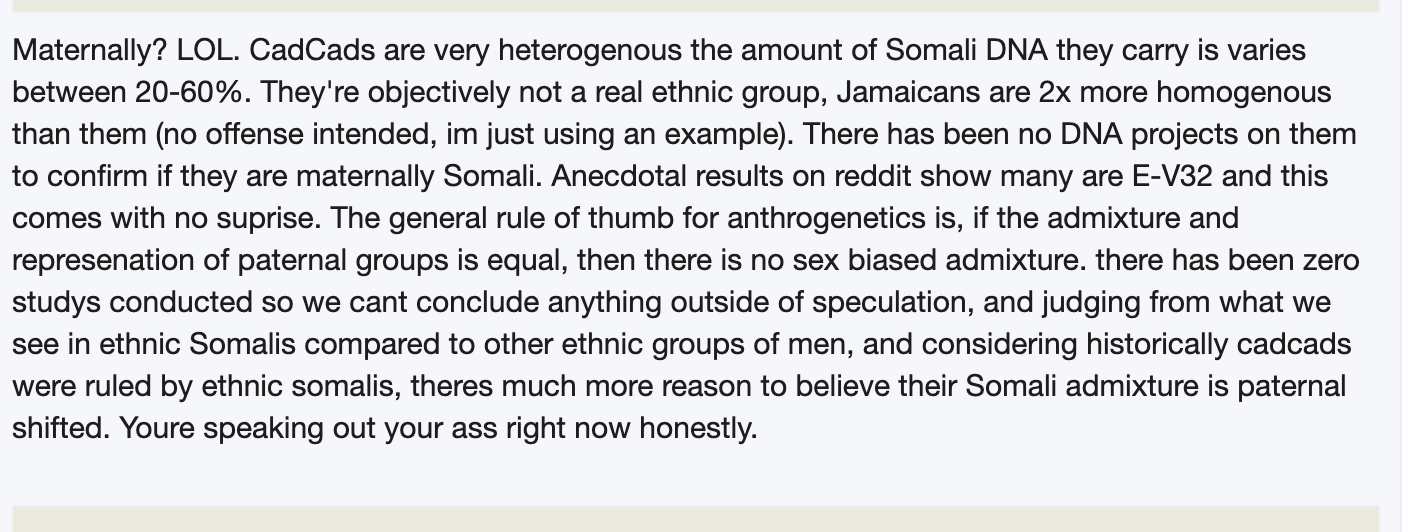 This nonsense right here, soo maaha? Let me screenshot it, in case he tries to delete it later on. Never in my life, have I seen someone try to claim that CadCads have Somali paternal lineage.